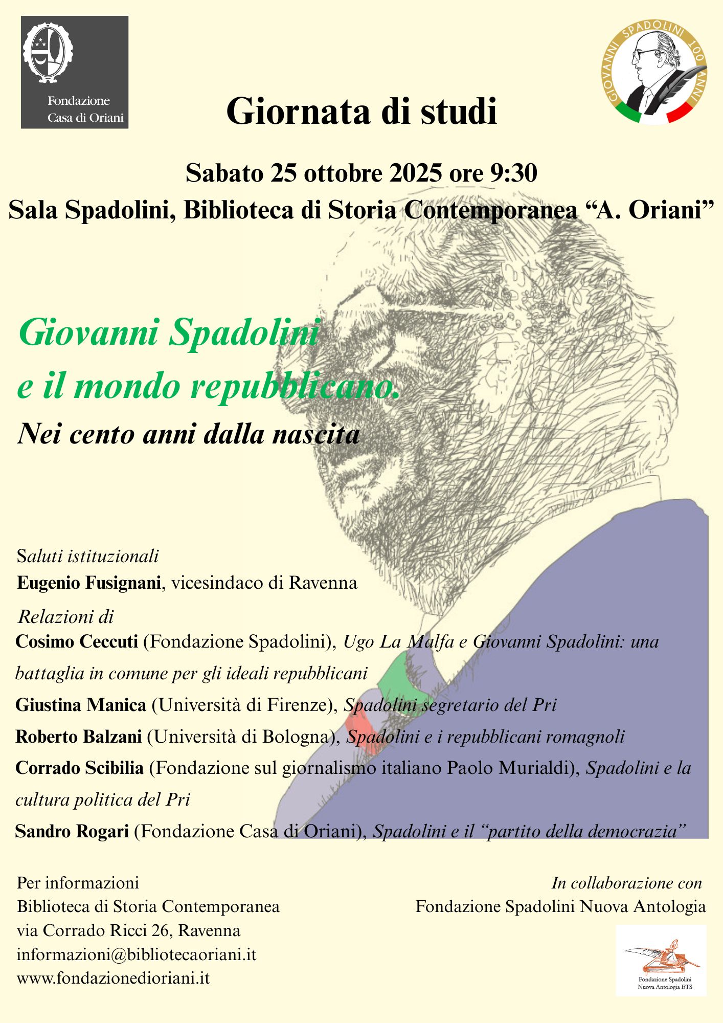 Si terrà sabato 25 ottobre 2025, con inizio alle ore 9.30, presso la Sala Spadolini della Biblioteca di storia contemporanea “A. Oriani” il convegno di studi dal titolo, Spadolini e il mondo repubblicano. Nei 100 anni dalla nascita. Il convegno, organizzato e promosso dalla Fondazione Casa di Oriani in collaborazione con la Fondazione Spadolini Nuova Antologia di Firenze per ricordare i cento anni dalla nascita dello storico e statista, che fu sempre molto legato alla istituzione Casa di Oriani, si concentrerà in particolare sul ruolo di Spadolini nella storia del movimento repubblicano italiano. Questo il programma: