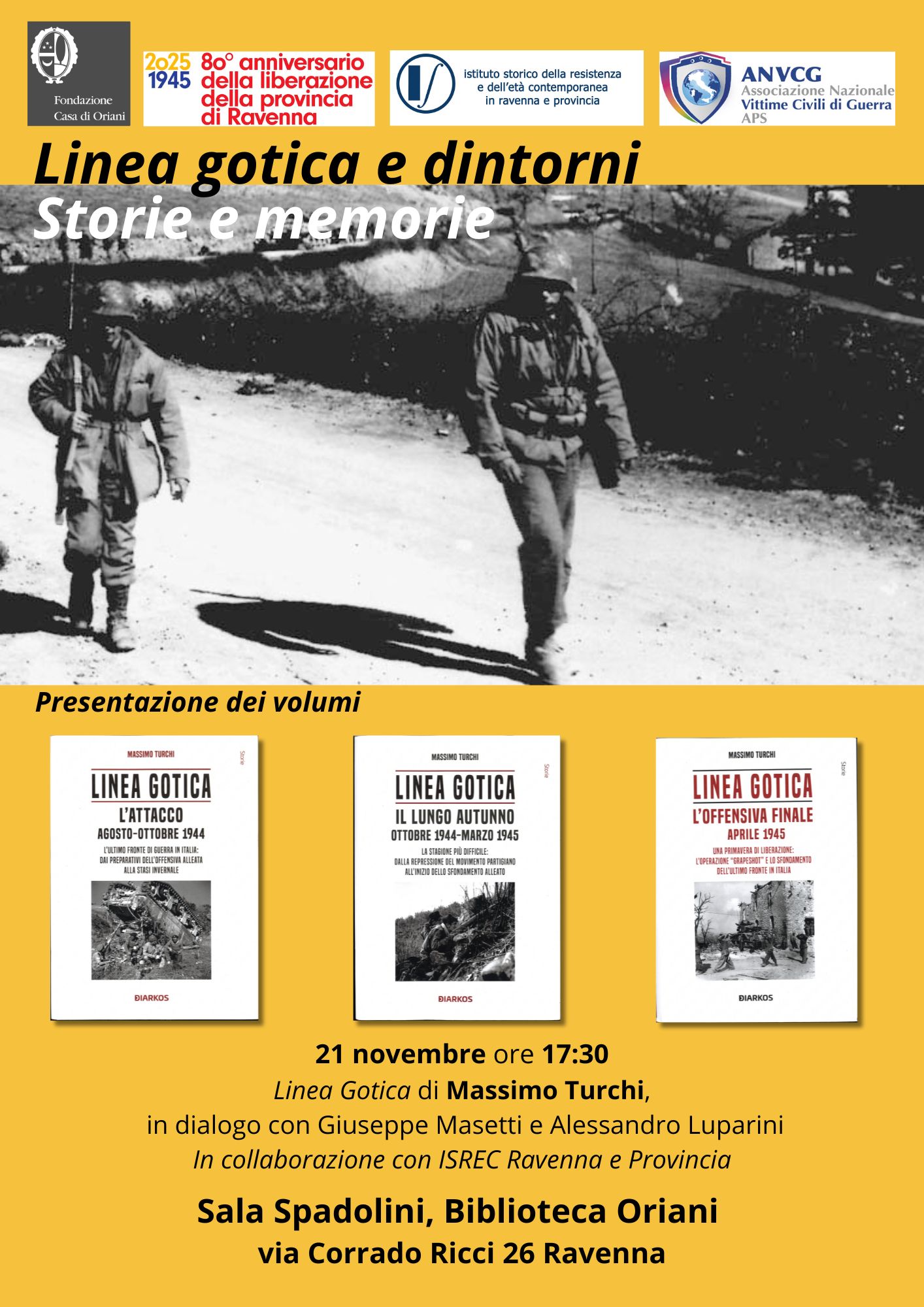 Si terrà venerdì 21 novembre 2025, ore 17.30, presso la Sala “Spadolini” della Biblioteca di Storia contemporanea “Oriani”, la presentazione dei tre volumi di Massimo Turchi, Linea Gotica (Diarkos 2024-2025), iniziativa organizzata in collaborazione con l’Istituto Storico della Resistenza e dell’Età contemporanea in Ravenna e Provincia.