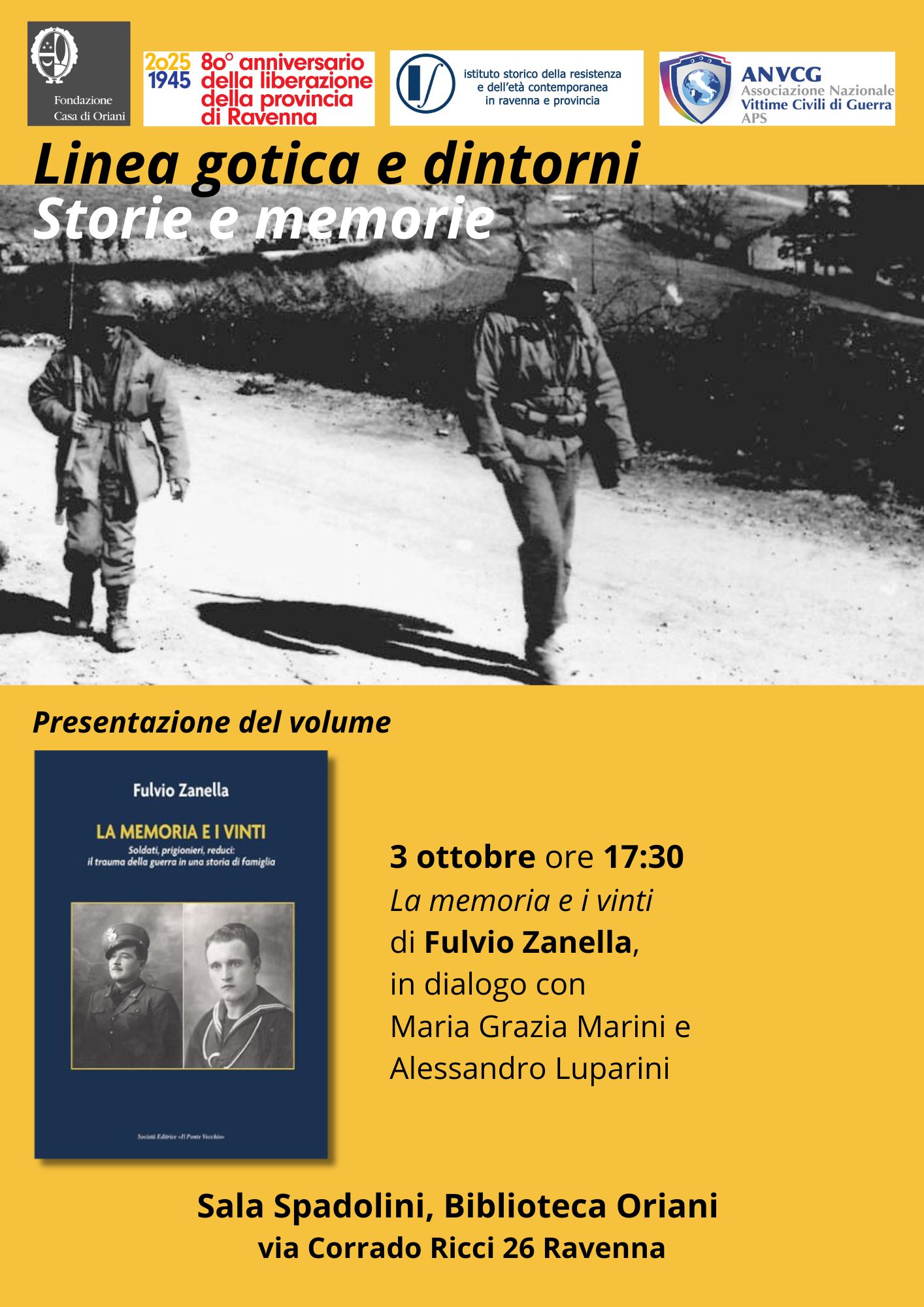 Si terrà venerdì 3 ottobre 2025, ore 17.30, presso la Sala “Spadolini” della Biblioteca di Storia contemporanea “Oriani” la presentazione del volume di Fulvio Zanella, La memoria e i vinti. Soldati, prigionieri, reduci: il trauma della guerra in una storia di famiglia («Il Ponte Vecchio» 2022). Il libro, sospeso tra grande storia collettiva e memorie familiari, ripercorre le traversie belliche del padre e dello zio dell’Autore, cresciuti nel quartiere popolare ravennate “Calcinelli” negli anni di massima affermazione del regime fascista. Attraverso testimonianze intime e pagine documentarie, si snoda così il racconto non solo della vita dei due protagonisti ma del destino di una intera generazione, segnata dalle illusioni della propaganda mussoliniana e scaraventata in una guerra assurda conclusasi nelle baracche del campo di prigionia alleato di Zonderwater in Sudafrica.