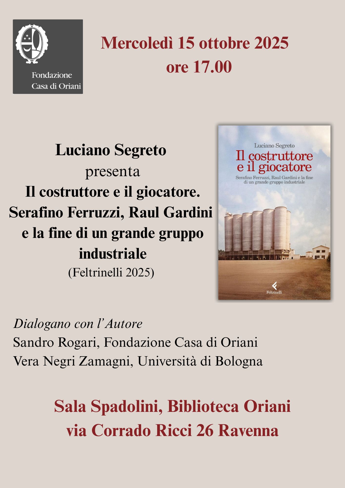 Si terrà mercoledì 15 ottobre 2025, ore 17.00, presso la Sala “Spadolini” della Biblioteca di Storia contemporanea “Oriani” la presentazione del volume di Luciano Segreto, Il costruttore il giocatore. Serafino Ferruzzi, Raul Gardini e la fine di un grande gruppo industriale (Feltrinelli 2025). Il libro, che sta riscuotendo un grande successo editoriale, racconta l’irresistibile ascesa e la drammatica caduta del Gruppo Ferruzzi, protagonista di una delle più importanti esperienze imprenditoriali del Novecento italiano. Nella sua approfondita ricerca Segreto si è avvalso, tra le molte fonti documentarie inedite, anche delle carte contenute nell’archivio della famiglia Ferruzzi-Sama, ora acquisito dalla Fondazione Casa di Oriani e le cui modalità di fruizione al pubblico verranno annunciate prossimamente.