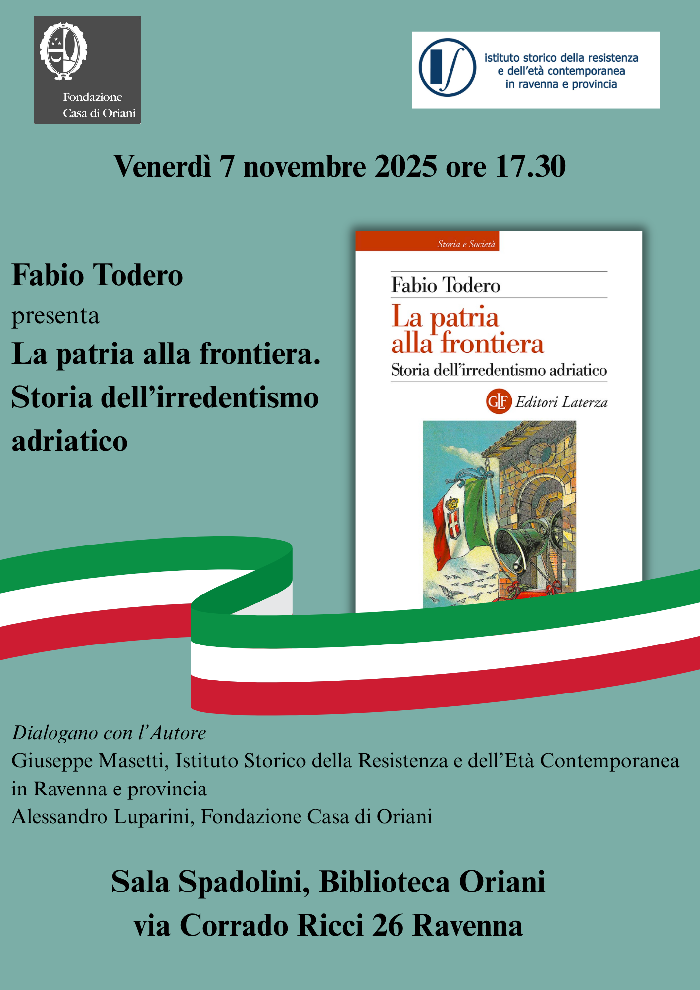 Si terrà venerdì 7 novembre 2025, ore 17.30, presso la Sala “Spadolini” della Biblioteca di Storia contemporanea “Oriani” la presentazione del volume di Fabio Todero, La patria alla frontiera. Storia dell’irredentismo adriatico (Laterza 2025), organizzata in collaborazione con l’Istituto storico della Resistenza e dell’età contemporanea in Ravenna e Provincia. Il libro traccia la storia dei vari movimenti irredentisti lungo la frontiera adriatica italiana. In quelle terre a lungo contese, infatti, si sono succeduti diversi irredentismi: dapprima, fino alla Grande guerra, quello italiano che ambiva a completare il Risorgimento contro l’Impero Austroungarico, poi, durante il fascismo, quello sloveno e croato in funzione antitaliana, poi di nuovo, dopo l’esito del secondo conflitto mondiale, quello italiano volto a salvare Trieste e l’Istria dalle aggressive rivendicazioni del neocostituito stato comunista jugoslavo. Gli irredentismi adriatici erano fieramente antagonisti, ma hanno spesso condiviso linguaggi, miti e comportamenti. Il volume di Todero ne segue per la prima volta l’intera vicenda, che ha segnato nel profondo una regione al centro di quella faglia di crisi che attraverso l’Europa orientale scende dal Baltico fino all’Adriatico, all’Egeo e al Mar nero, e i cui sussulti ancora oggi ci allarmano.