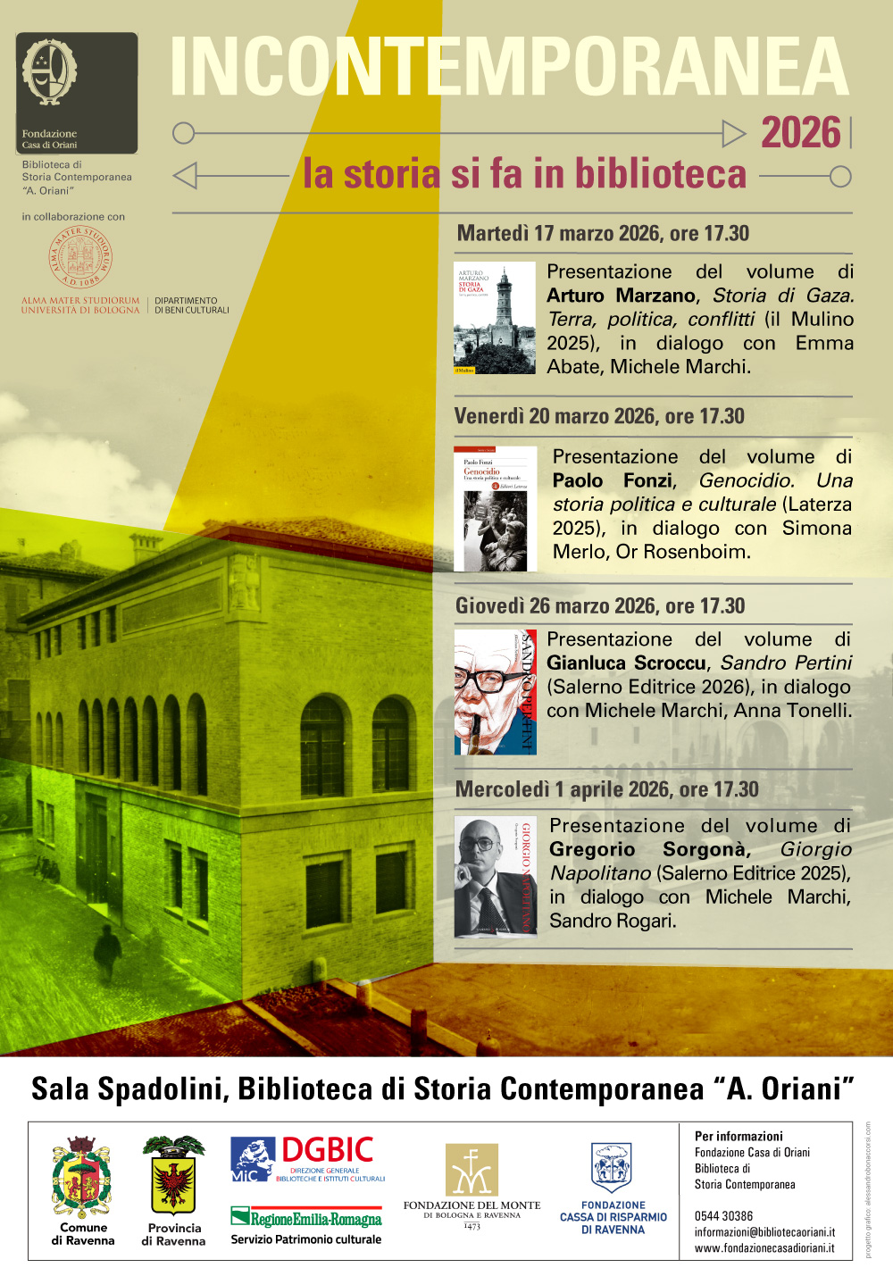La Fondazione Casa di Oriani – Biblioteca di Storia Contemporanea, in collaborazione con il Dipartimento dei Beni Culturali dell’Università di Bologna, ha organizzato per la seconda metà di marzo la presentazioni di due volumi su temi di rilevante attualità. Martedì 17 marzo 2026, ore 17.30, si terrà la presentazione del libro di Arturo Marzano, Storia di Gaza. Terra, politica, conflitti (il Mulino 2025). Il libro ricostruisce con rigore la storia della martoriata terra di Gaza dalla fine dell’Ottocento ai giorni nostri, una vicenda decisiva per comprendere le ragioni del conflitto israelo-palestinese e più in generale le dinamiche degli equilibri politici in Medio Oriente che l’Autore racconta non solo dal punto di vista politico-militare, ma anche culturale, sociale, demografico ed economico.