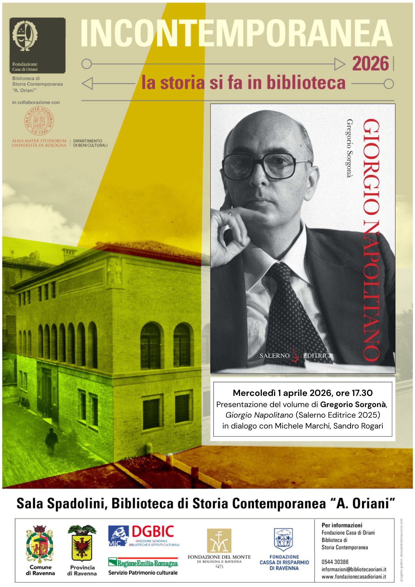 Si terrà mercoledì 1° aprile 2026, ore 17.30, presso la Sala Spadolini della Biblioteca Oriani, la presentazione del libro di Gregorio Sorgonà, Giorgio Napolitano (Salerno Editrice 2025). Il libro ricostruisce la biografia dell’undicesimo presidente della Repubblica, il primo a essere rieletto; uno dei più longevi politici italiani, la cui vita pubblica, durata circa settant’anni, si è intrecciata a fondo con la storia d’Italia, dalla ricostruzione sulle ceneri del fascismo all’era digitale. L’Autore racconta questo lungo percorso, esplorando un vastissimo materiale di archivio e dialogando con i tanti scritti storici e giornalistici dedicati alla figura di Napolitano e alla storia delle organizzazioni e delle istituzioni che lo hanno visto attivo protagonista.